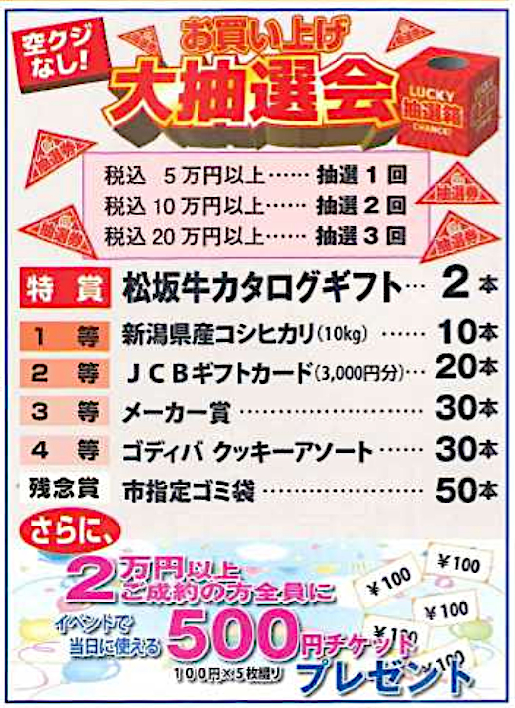 秋の大感謝祭では、ご成約の金額に応じて引けるお買い上げ大抽選会を開催!
